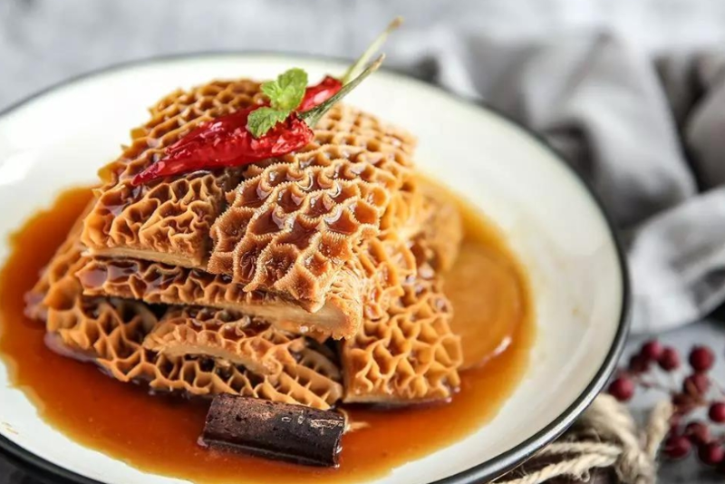 网胃通常被称为【金钱肚】,标志的蜂窝状结构非常容易辨认出来。潮汕地区的卤水金钱肚是非常常见的小吃。